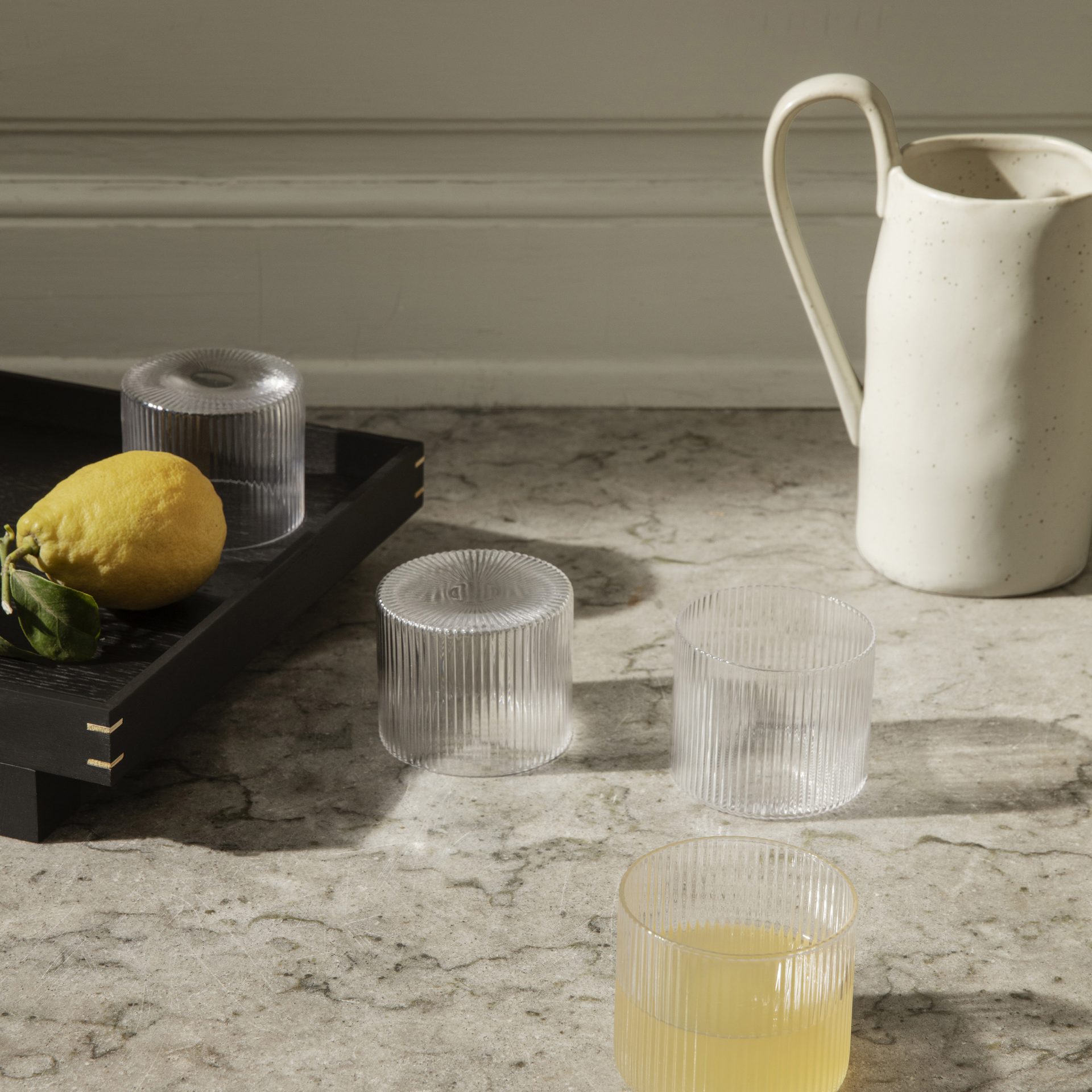 Denna uppsättning med fyra låga glas har en distinkt, vackert räfflad yta. De vertikala linjerna tillför en stark och sofistikerad look till sin diskreta, klassiska form och är perfekta för avslappnad middag. Kombinera dem med andra glas i Ripples glaskollektion för en enhetlig matupplevelse.