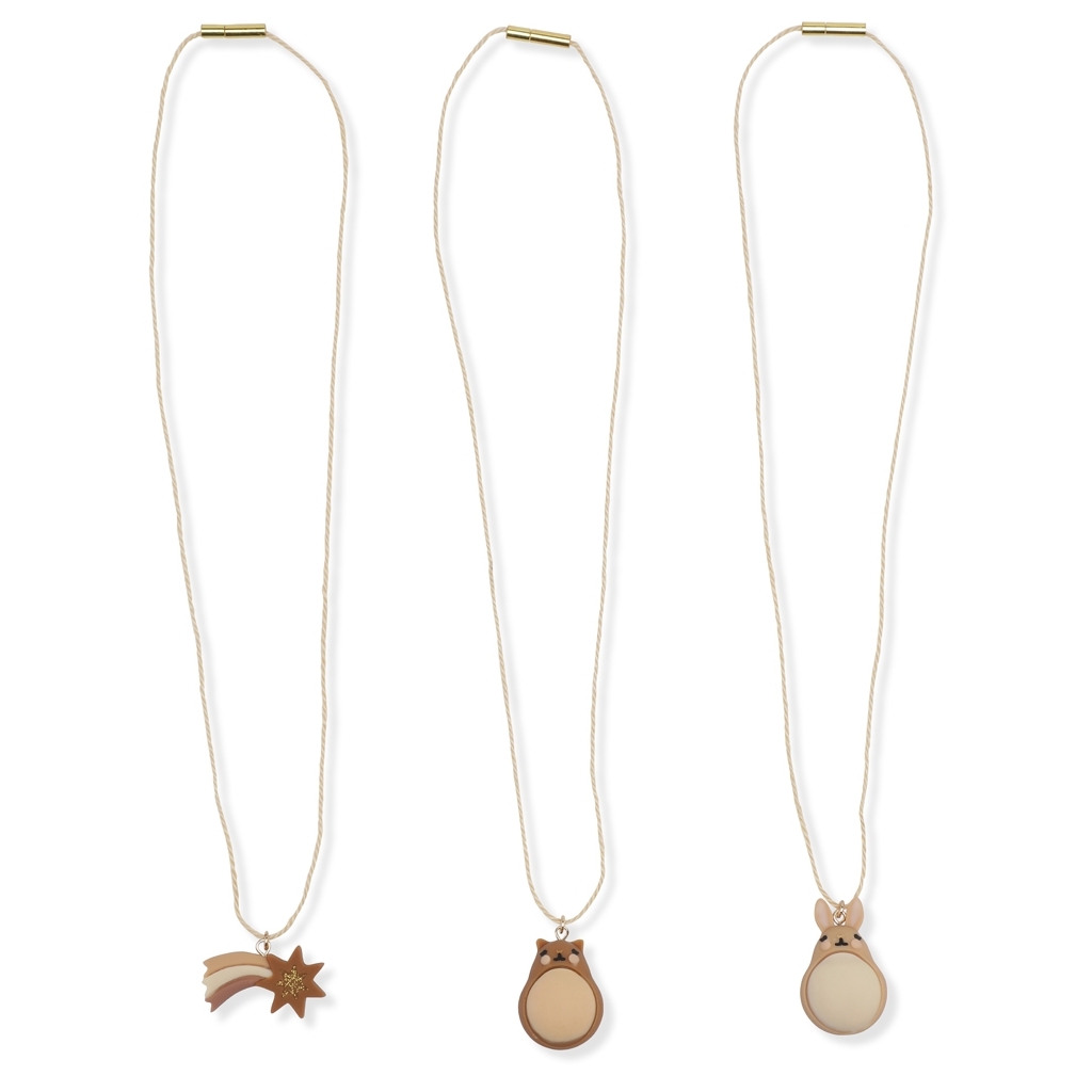 Tre halsband med olika berlocker i polyresin och mässing. Varje halsband har en magnetisk säkerhetsstängning.