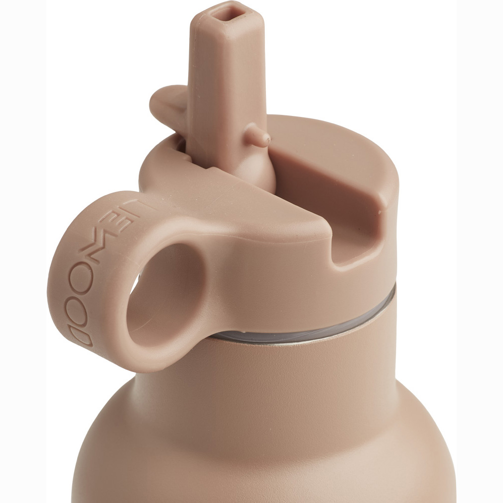 Den supersöta vattenflaskan från Liewood kan både hålla 350 ml vätska varmt och kallt. Du väljer om du vill ha en vanlig kork på eller den sportiga. Båda ingår.