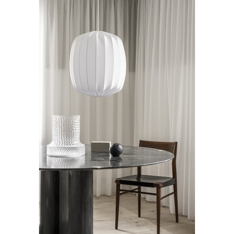 Takskärmen Prisma 45 vit, med matt och lyxigt bomullsjersey spänd över en smäcker ståltrådsform, hänger som geometrisk pennstudier över matsalsbordet. Otroligt elegant med sina vertikala linjer och den lätta rundningen som ger precis den rätta organiska touchen. Snygg i dagsljus, alltså, och när kvällen kommer och lampan tänds ger Prisma ett mjukt och härligt stämningsljus.